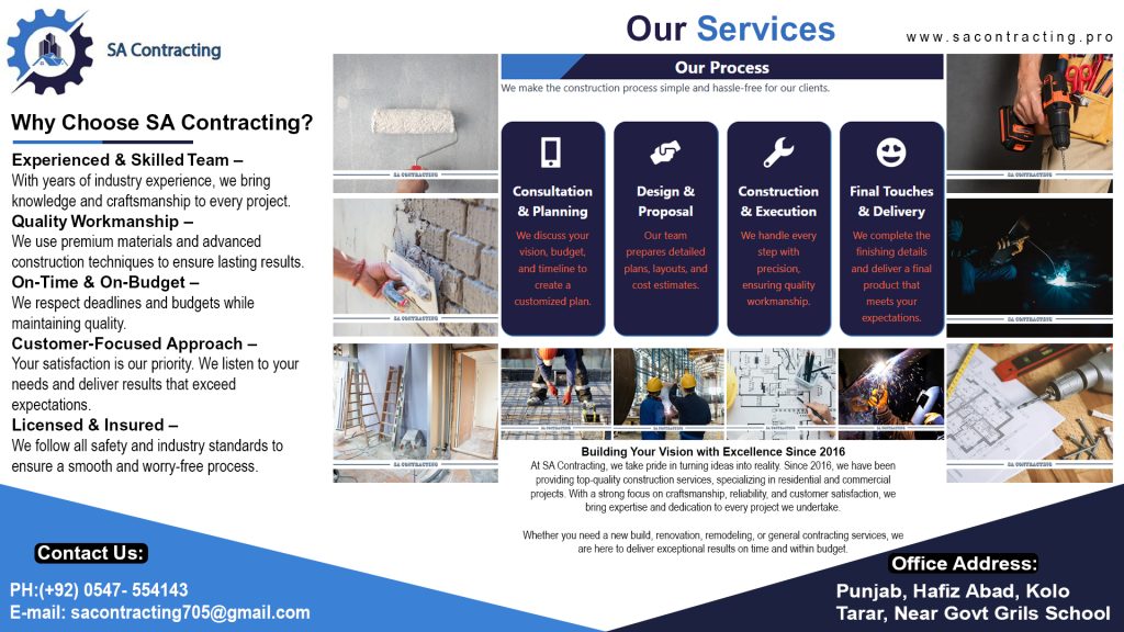 SA Contracting is a trusted name in the construction industry, known for our professionalism, high standards, and commitment to quality. We understand that every project is unique, and we tailor our services to meet your specific needs. From concept to completion, our team ensures seamless execution, attention to detail, and superior workmanship.